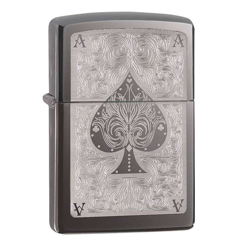 Lo Zippo Ace Filigree su una base Black Ice colpisce per il motivo dell'asso inciso artisticamente e ricco di dettagli raffinati. Questo accendino antivento con l'iconico clic viene fornito in un'elegante confezione regalo – un simbolo di fortuna e successo.
