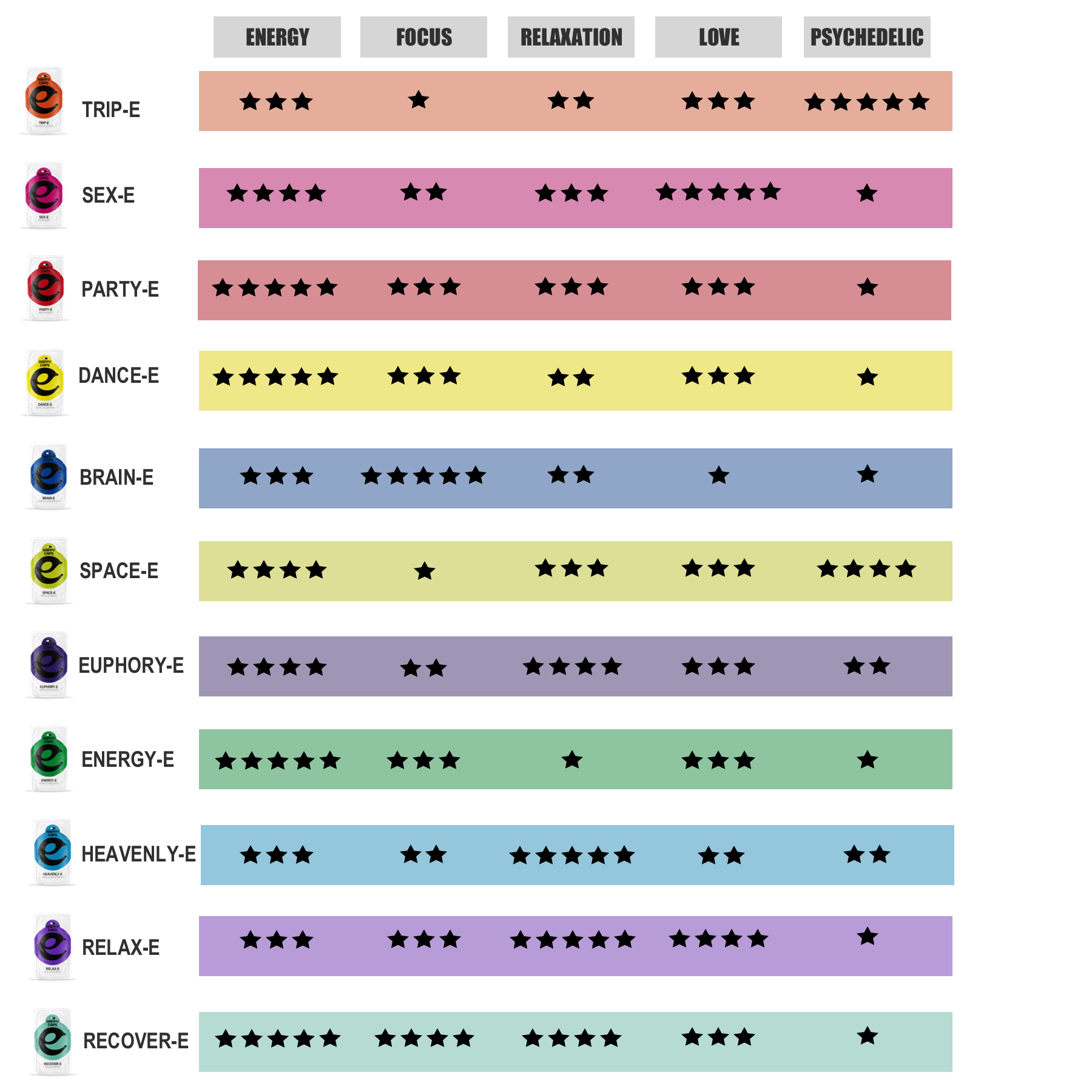 Euphory-E jest idealny na imprezy, spotkania towarzyskie lub po prostu na poprawę nastroju. Oferuje doskonałą równowagę między energią a relaksem, sprawiając, że czujesz się radosny i wolny. Produkt wspomaga również koncentrację bez nerwowości, która często towarzyszy stymulantom.