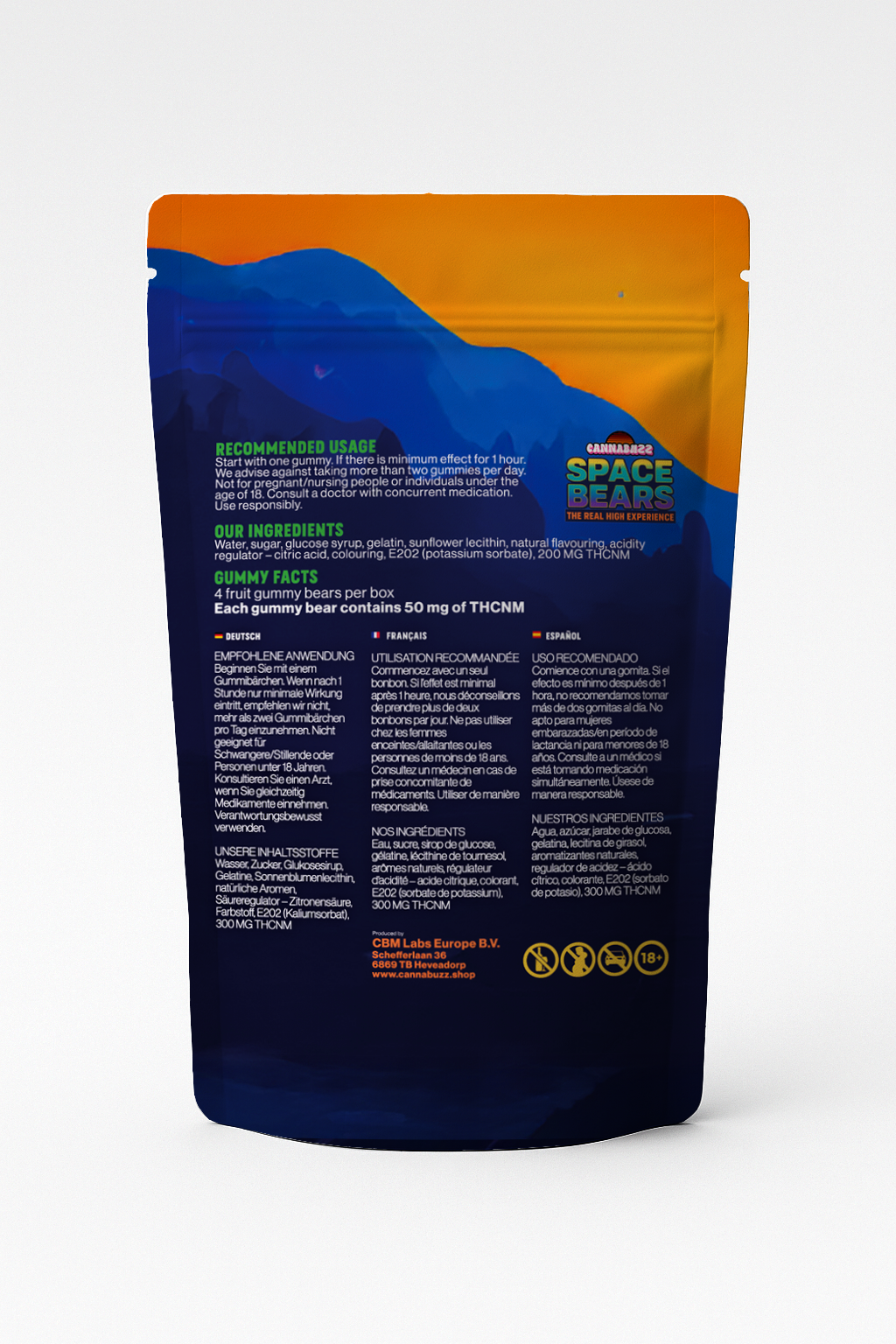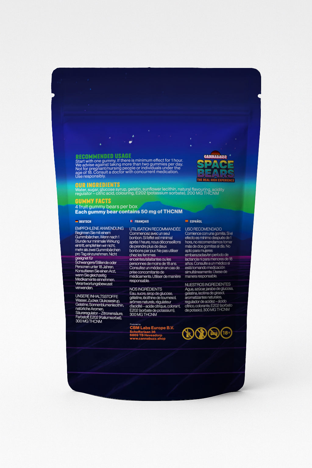 Space Bears met THCNm bieden een heldere, gecontroleerde high die verrassend dicht in de buurt komt van het originele gevoel. Vier gummies per verpakking, vijf onweerstaanbare smaken.